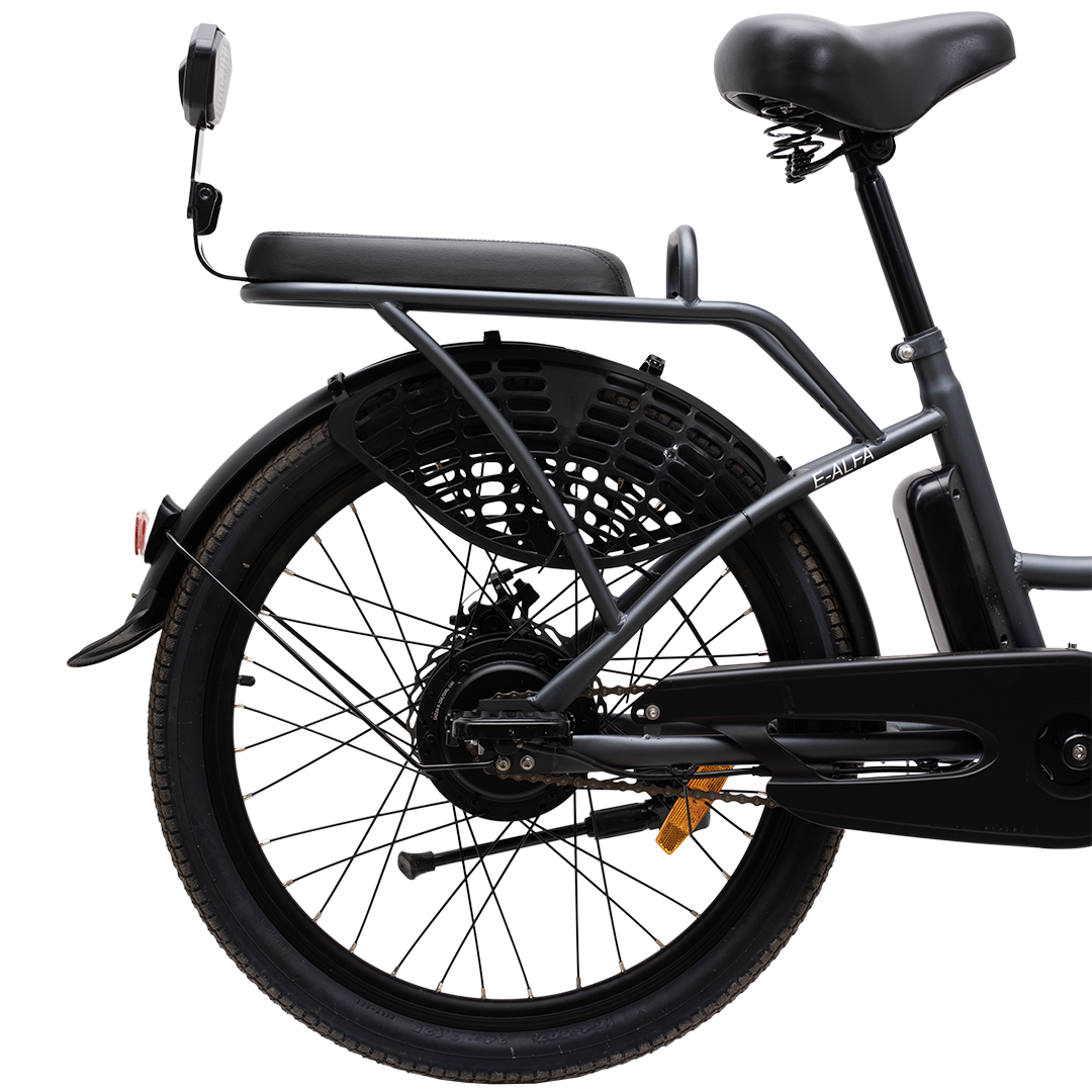 Вес - 33 кг. ECOLINER  e-alfa  - отличный выбор для людей предпочитающих комфортные городские передвижения и прогулки на природе. Это надежный и качественный транспорт, который будет отличным индивидуальным средством передвижения в тяжелых условиях. Жители деревень и дачных поселков полюбят его в качестве повседневного помощника. Ведь эта модель без проблем справляется с любым типом покрытия, от асфальта до бездорожья. Большую корзину, расположенную спереди, можно применять для перевозки малых грузов. Наличие амортизационной передней вилки, защиты на цепи и крыльев с брызговиками, и прочной подножки. Все это предоставляет дополнительный комфорт. В ночное время или при тяжелых погодных условиях безопасность езды обеспечат яркая светодиодная фара и задний фонарь, а также габаритные зеркала с повышенным углом обзора. Надежная рама из стали, мотор номинальной мощностью 240 Ватт который в пике развивает до 500 Ватт, усиленные обода и качественные шины - эти качества делают модель отличным эко транспортом.