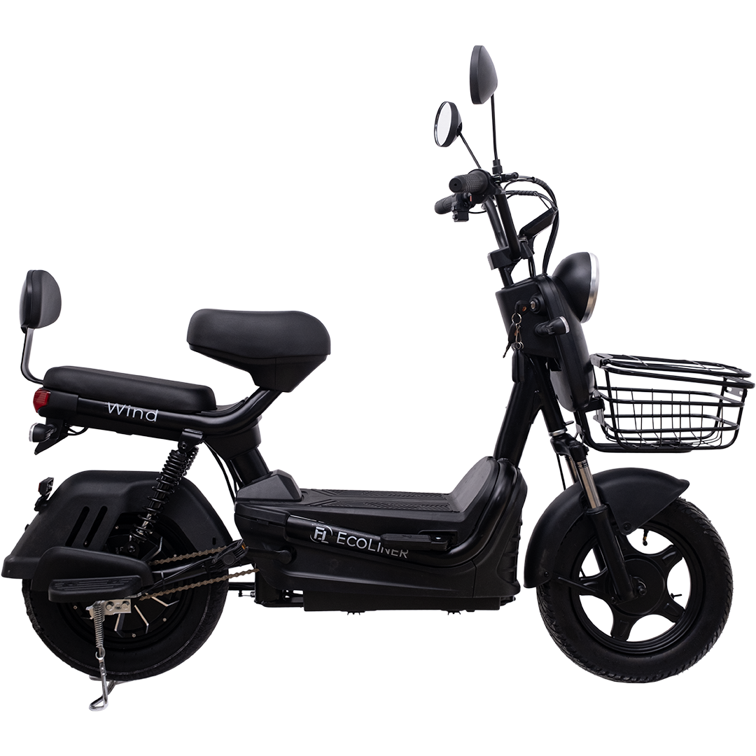 Электрический велосипед Ecoliner Wind Bluetooth – двухместный с загрузкой 130кг, не требующий водительских прав, Максимальная скорость 25 км/ч, при этом она может достигать 40 км/ч. Благодаря мощному бесщеточному электродвигателю, установленному в заднем колесе, номинальной мощностью 240w, в пике развивающему 500w. Пробег при скорости в 25 км/ч – 35-45км. Этому способствует батарея 48 В 23 А·ч, и синусойдному контроллеру с 6 ключами. Установлены мотошины 10” (аналог 14 более простой) что поспособствует более высокой износостойкости. минимум в 2 раза относительно 14”. Дисплей жидкокристаллический, цветной. Для более плавной и комфортной езды установлены передний и задний амортизаторы и дополнительными подставками для ног. Спереди расположена корзина. Сигнализация с 2мя брелками. Мощный свет который обеспечивается линзованной оптикой. Оснащен встроенной колонкой для музыки. Подключается к телефону через bluetooth.  Указатели поворотов со звуковым сигналом. В подарок вы получите шлем с защитным щитком.