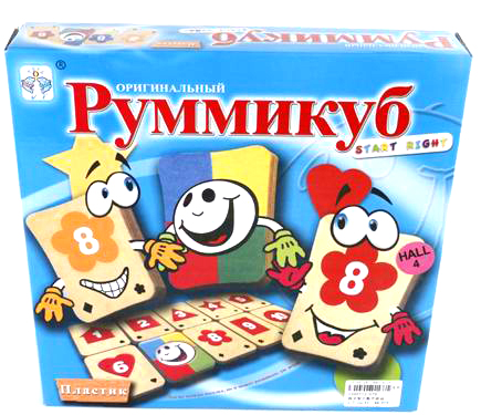 "Руммикуб" состоит из четырёх разноцветных комплектов: красный, синий, жёлтый и зелёный. Каждый комплект содержит цифры от 1 до 10. Чтобы маленькие дети легче различали цифры, каждая цифра имеет свою постоянную форму на карточке: например, квадрат, треугольник, сердце, звезда и т.д. Цель игры: выстроить карточки парами. Коробка, 27х5х26,5 см.