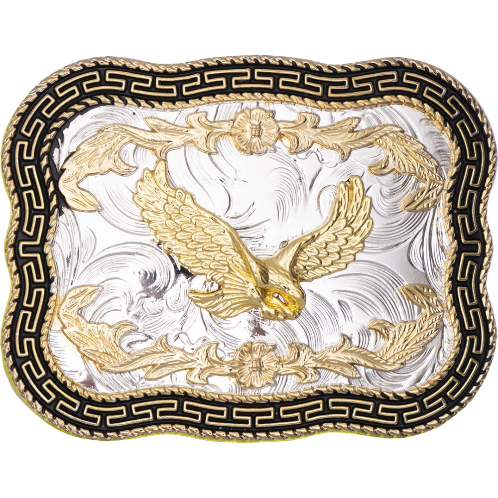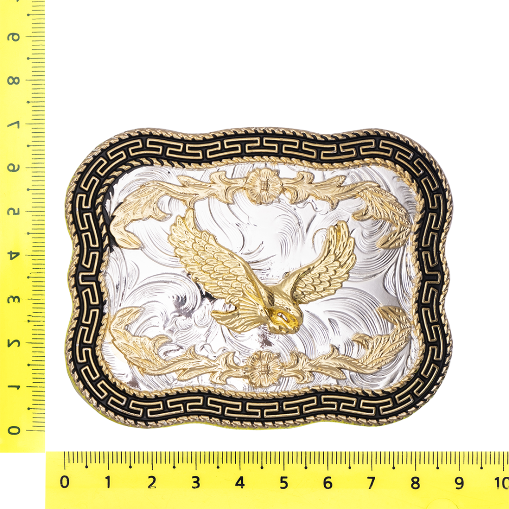 Большая металлическая пряжка для ремня с изображением золотого орла, комбинированного серебристого и черного цвета.