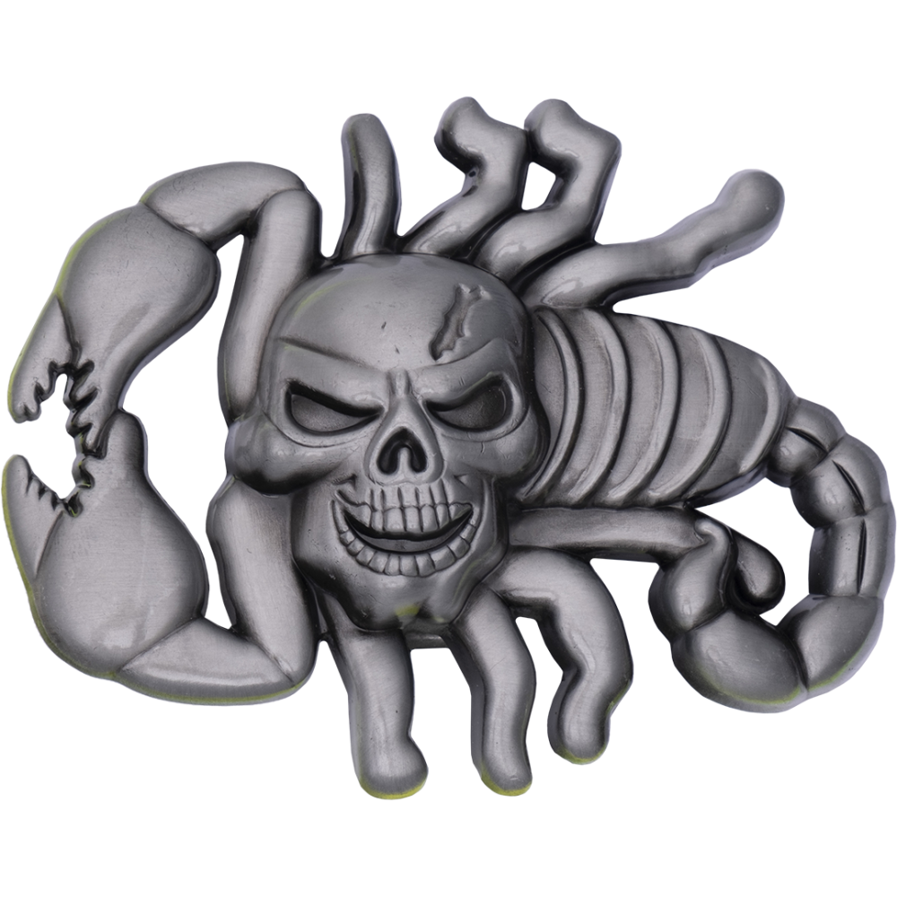 Металлическая пряжка для ремня из серебристого металла форме скорпиона с головой-черепом.