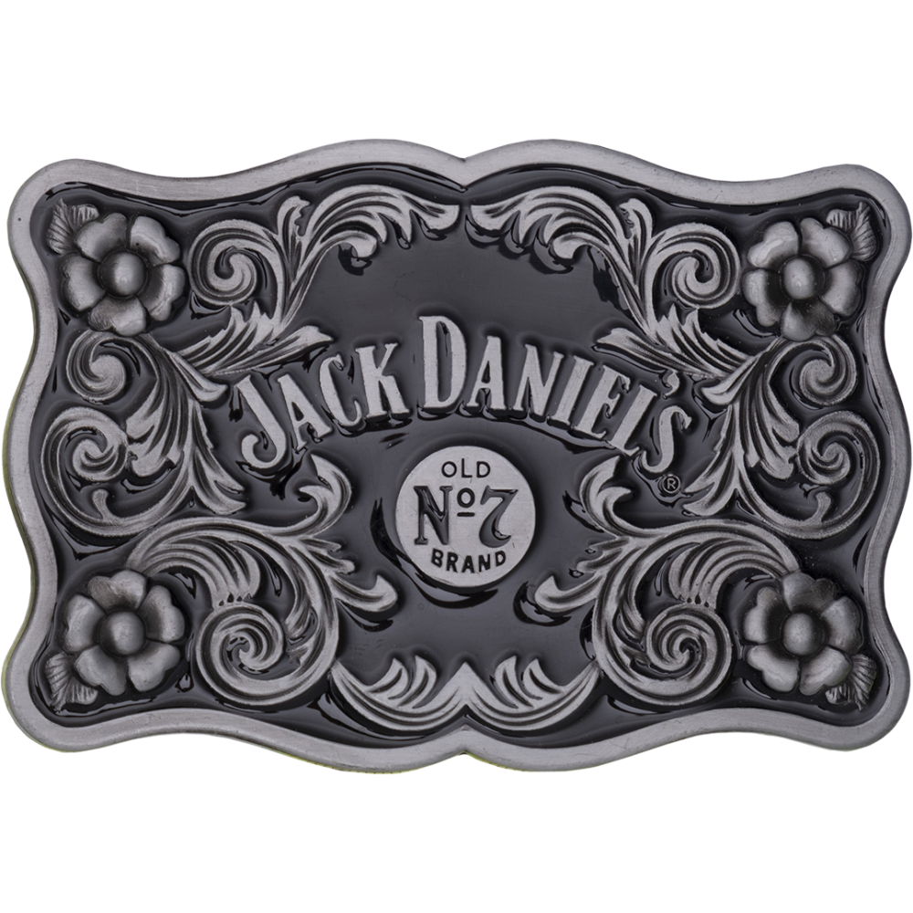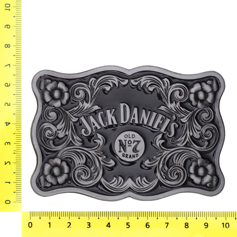 Большая металлическая пряжка для ремня, стилизованная под этикетку от знаменитого виски Jack Daniels и покрытием из черной эмали.