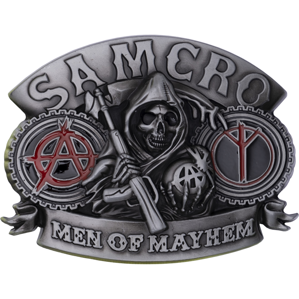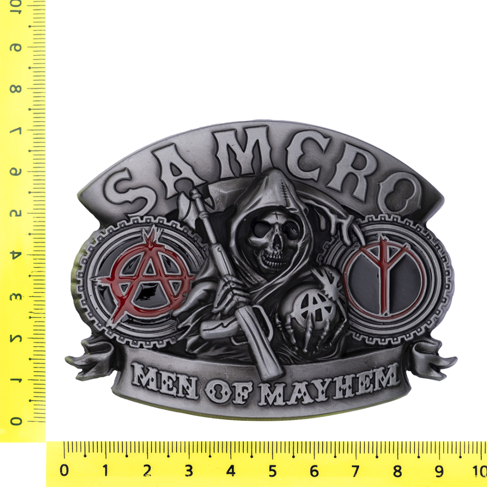 Металлическая пряжка для ремня с изображением черепов и покрытием из цветной эмали.