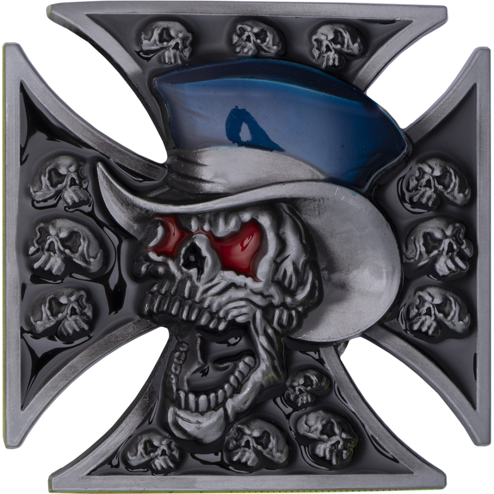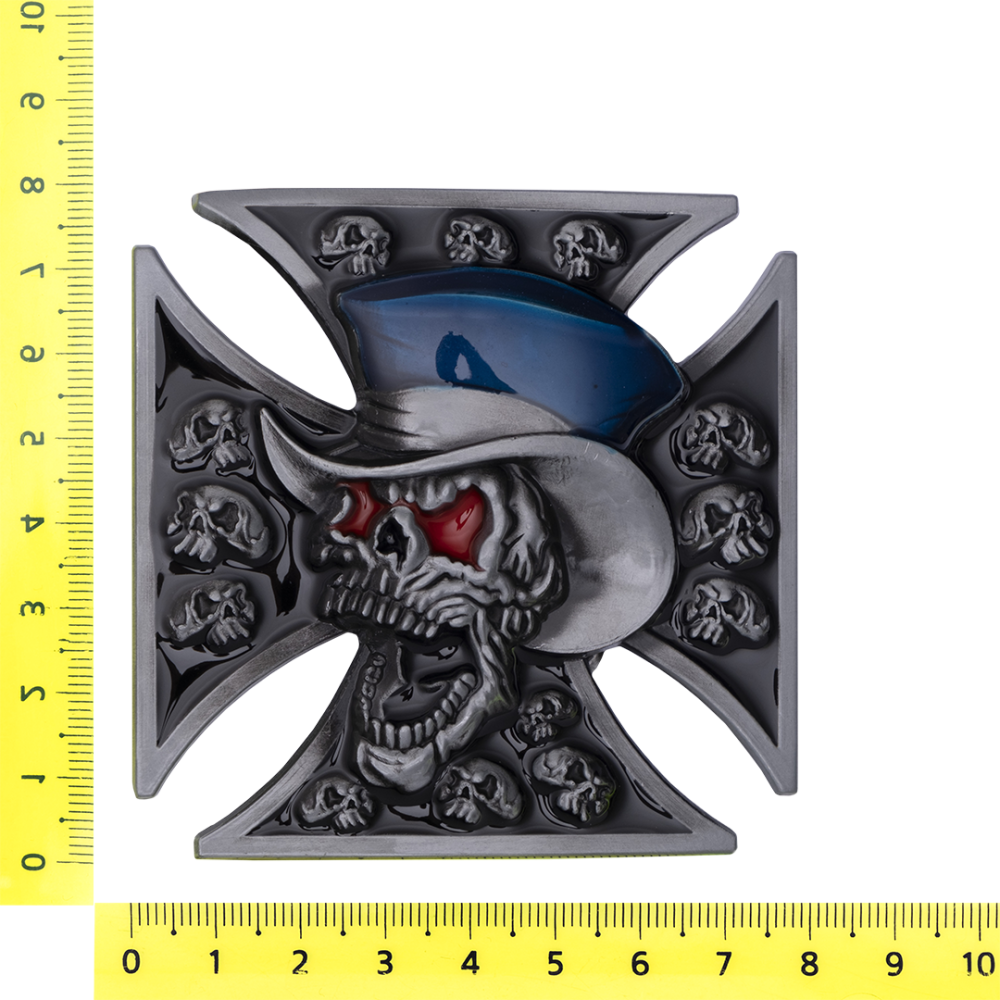Металлическая пряжка для ремня с изображением черепов и покрытием из цветной эмали.
