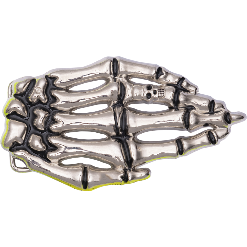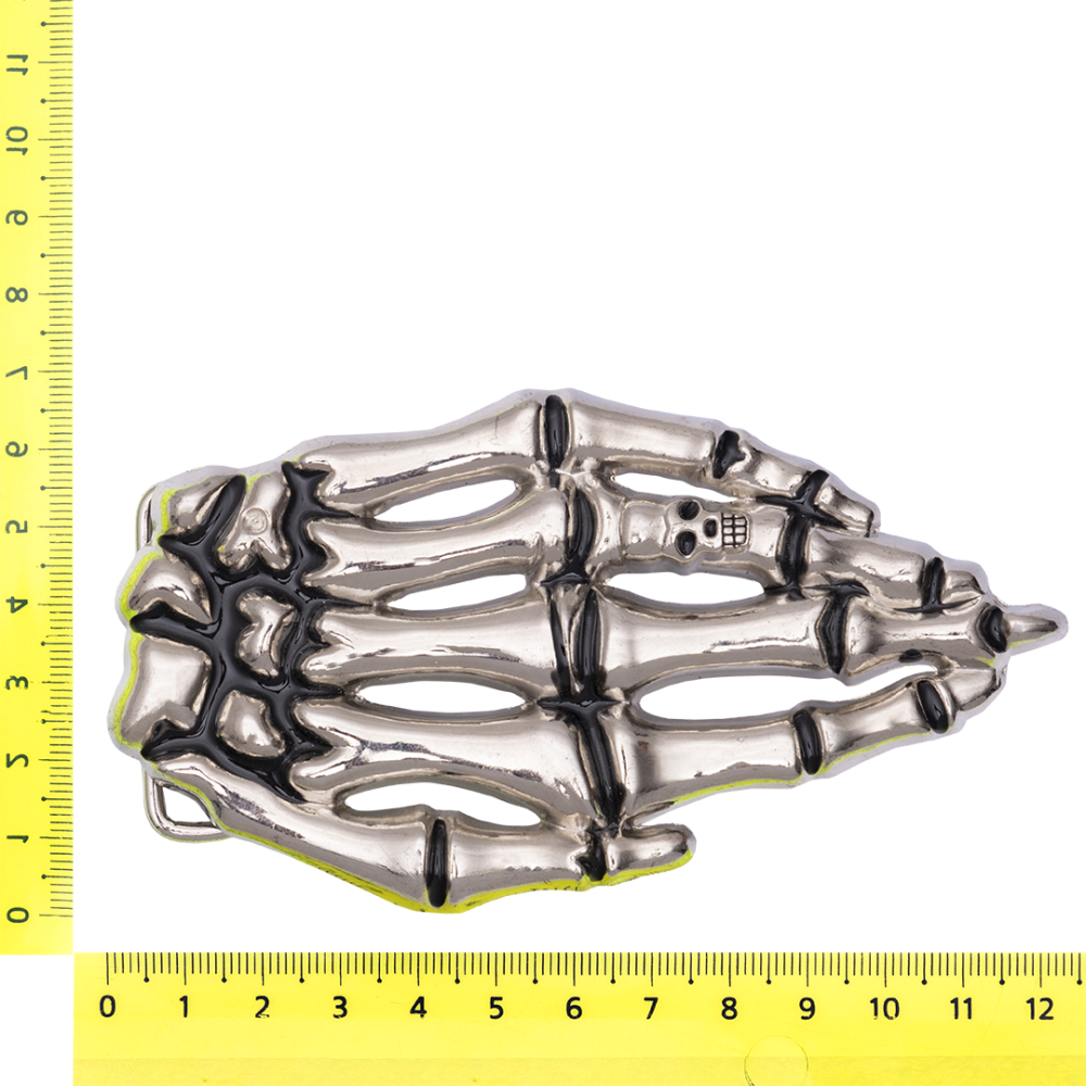 Металлическая пряжка для ремня из хромированного металла форме руки скелета.