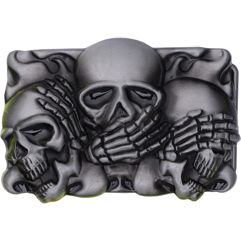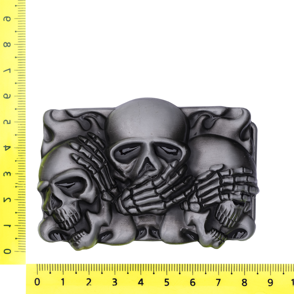 Металлическая пряжка для ремня из серебристого металла с изображением трёх скелетов "ничего не слышу, ничего не вижу, ничего не скажу " с вставками из черной эмали.