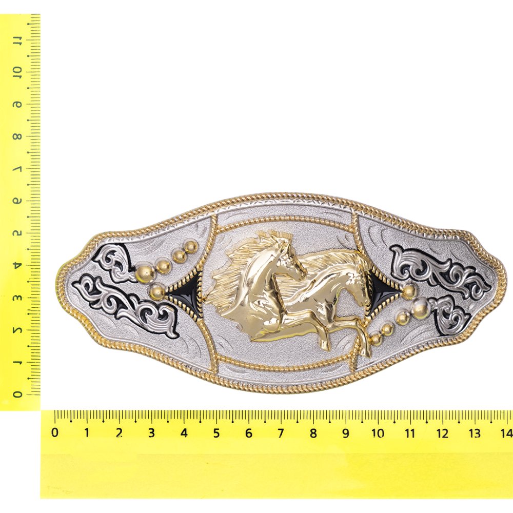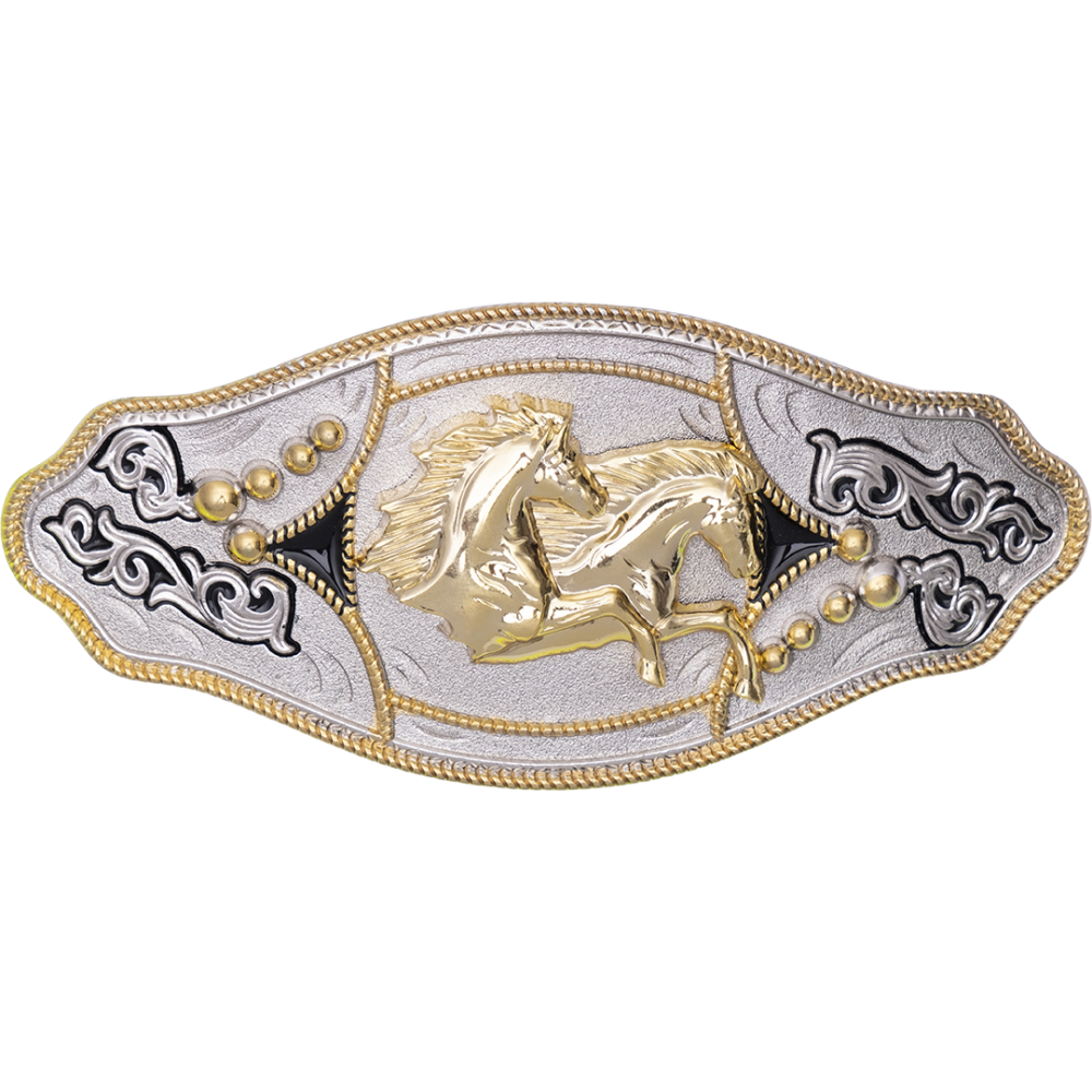 Большая металлическая пряжка для ремня с изображением двух скачущих лошадей, комбинированного серебристого и золотистого цвета с вставками из черной эмали.