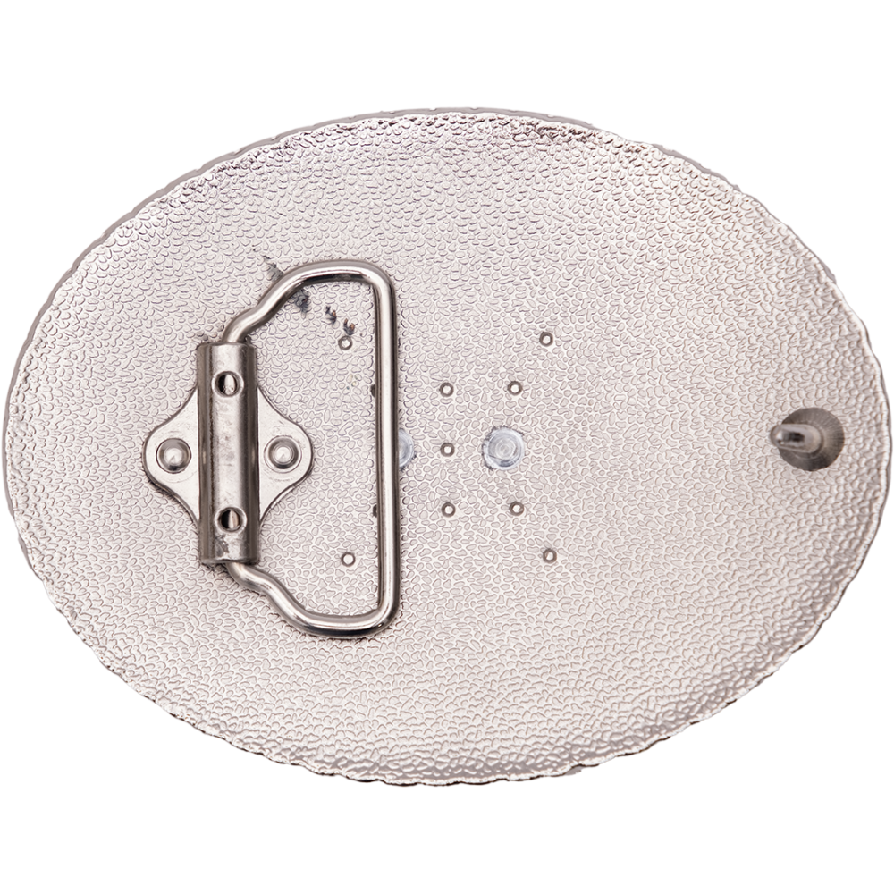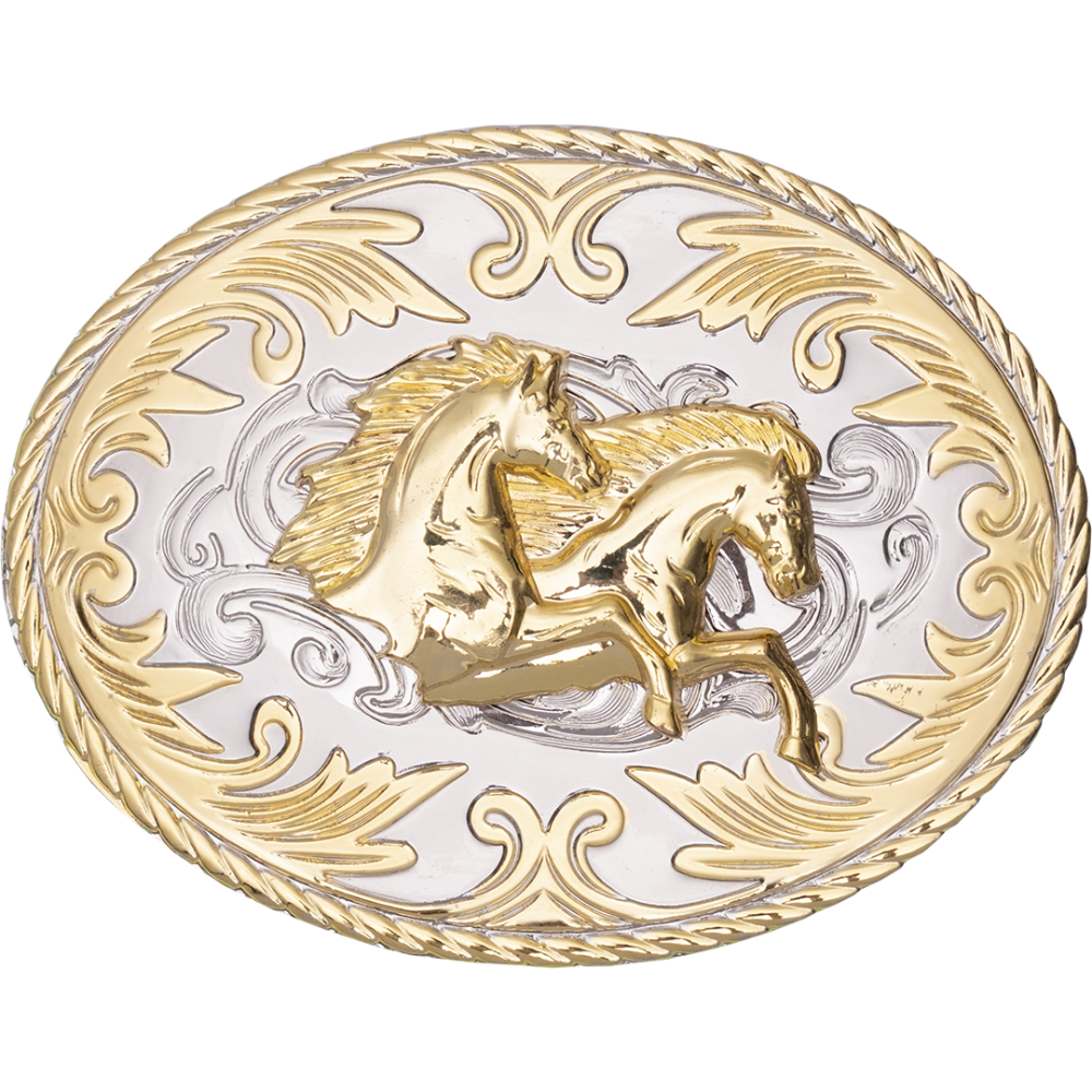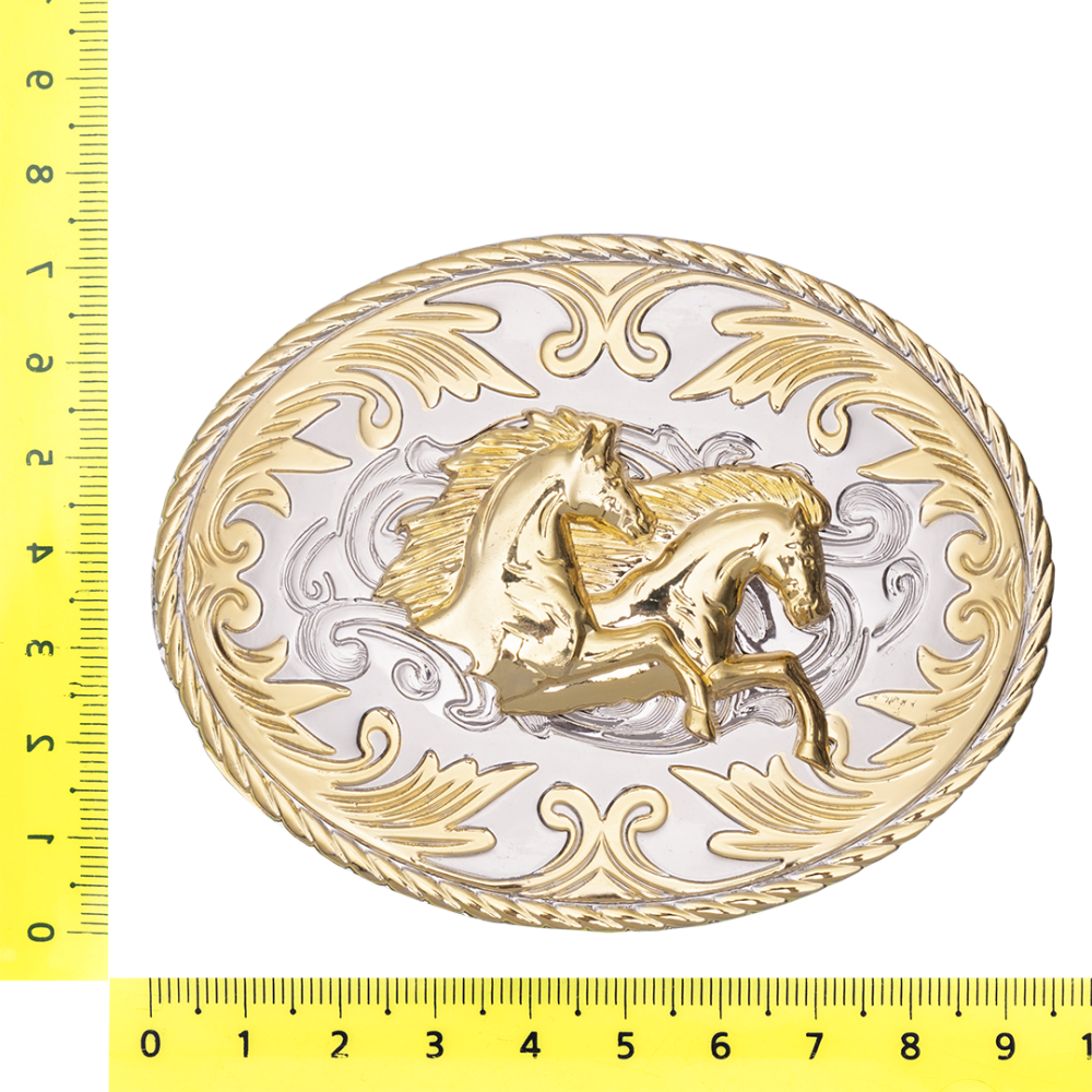 Металлическая пряжка для ремня овальной формы с изображением двух скачущих лошадей, комбинированного серебристого и золотистого цвета.