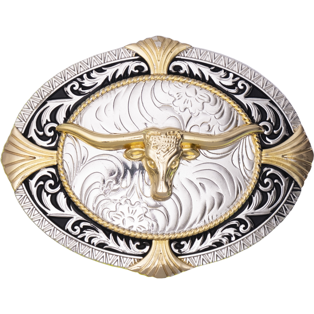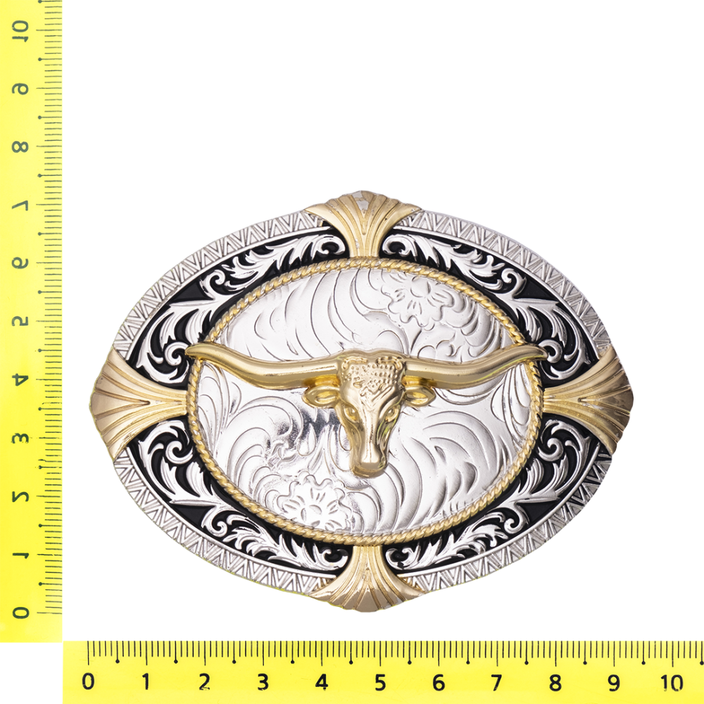 Металлическая пряжка для ремня овальной формы с изображением головы быка, комбинированного серебристого и золотистого цвета с вставками из черной эмали.