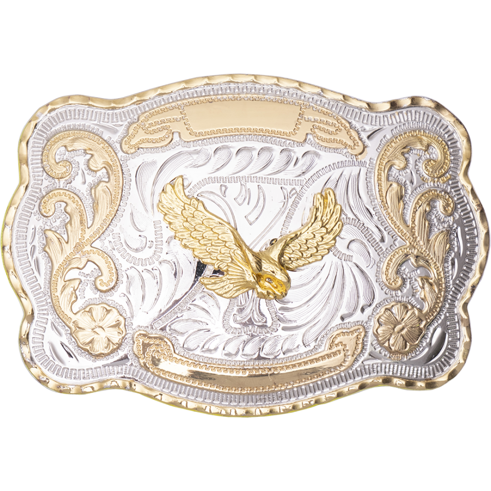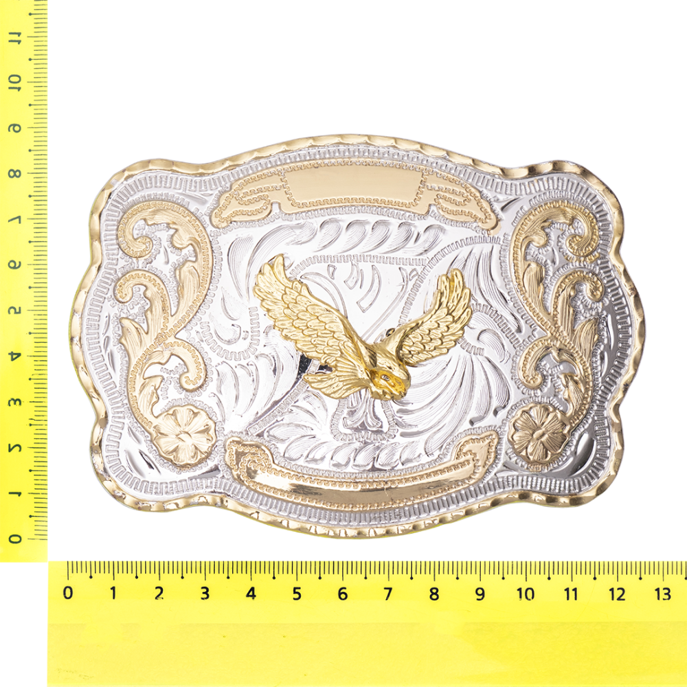 Большая металлическая пряжка для ремня с изображением орла, комбинированного серебристого и золотистого цвета.